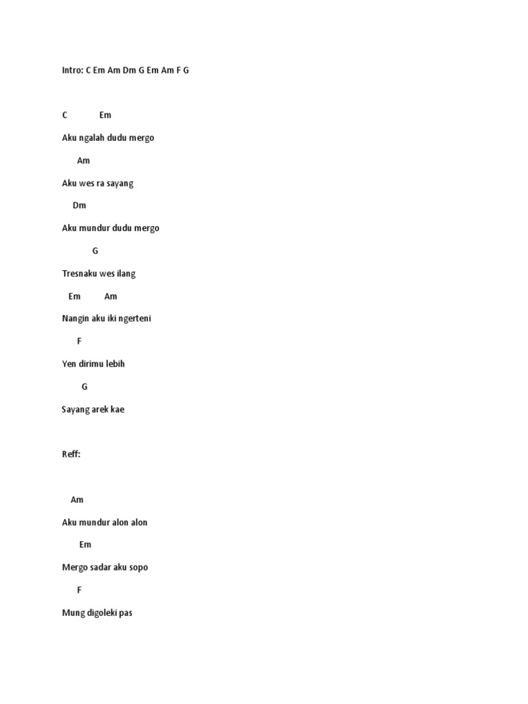 A chord mundur alon alon. C g am em f c am dm g. Am aku mundur alon alon em mergo sadar aku sopo f g c e mung di goleki pas atimu perih. F mung dibutuhno pas. Em mergo sadar aku sopo.