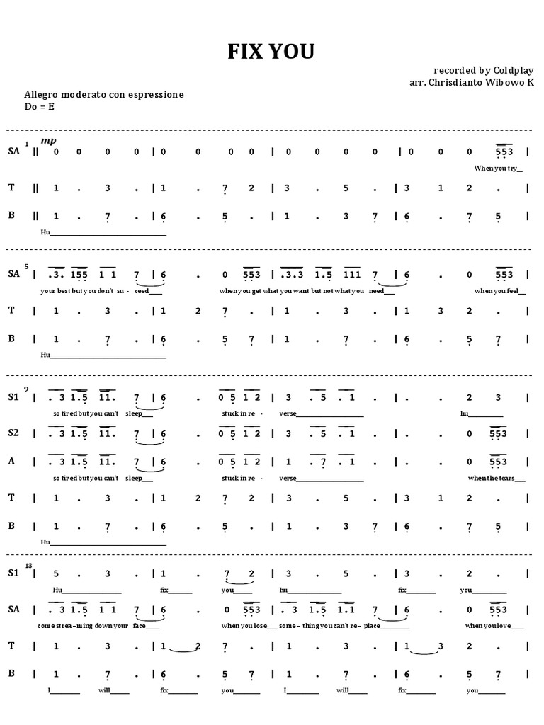 Choral Music Sheet Fix You Not Angka Leisure